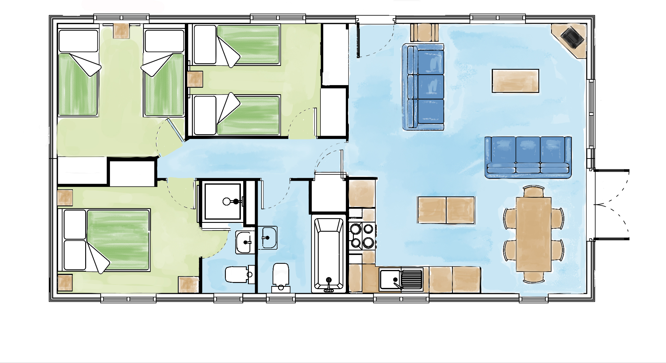 - Accommodation for 6 guests in one double and two twin bedrooms